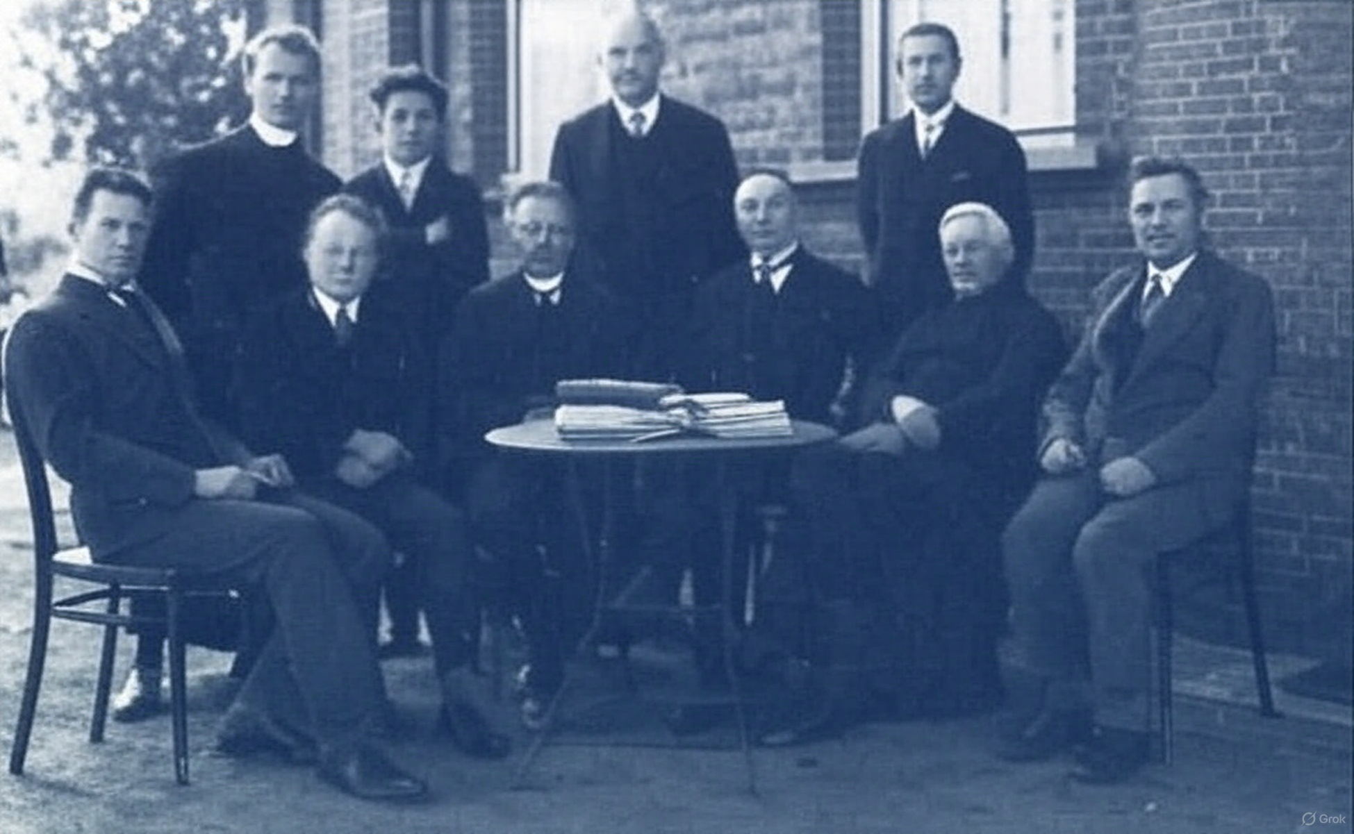 Zittend: Frans Verstraelen, K.C. Peeters, Jef Van Der Jonckheyd, baron Robert de Kerchove, pastoor van Horenbeeck (Gooreind) en Arthur Bosschaerts.
